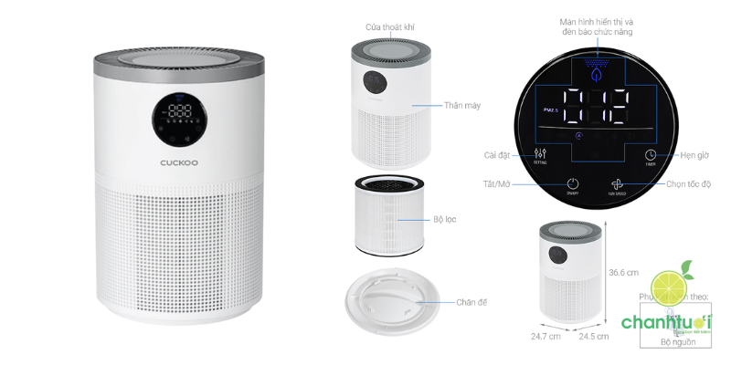 - Tiện ích: Đèn báo chất lượng không khí, báo thay bộ lọc, hẹn giờ 1–24h, luồng khí 360°
