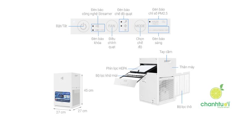 - Cảm biến bụi PM0.3, đèn LED báo chất lượng không khí.