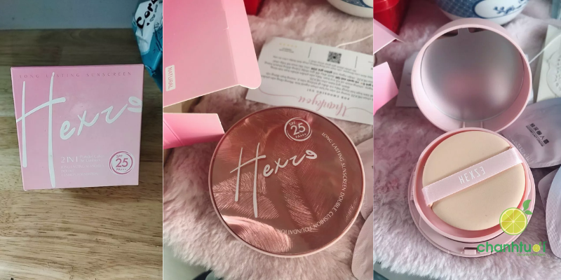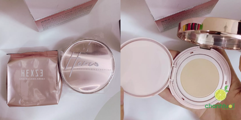 Phải công nhận HEXZE rất chăm chút phần thiết kế. Bao bì của em cushion này đẹp và sang xịn, phần chữ in nổi tạo cảm giác cầm chắc tay, “sờ cũng đã”. Sản phẩm được đóng gói kỹ, giao hàng cẩn thận nên khi nhận cảm giác rất chỉn chu. Bên trong gồm 1 lõi cushion 13g, 1 phấn phủ 6.5g, 1 mút cushion và 1 bông phấn phủ – đúng chuẩn “tất cả trong một”, cực kỳ tiện lợi.
