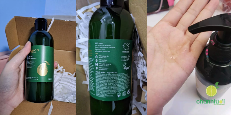 Thiết kế của Cocoon Pomelo Shampoo khá đơn giản nhưng vẫn tinh tế đúng kiểu “thuần chay”. Chai nhựa màu xanh lá đậm, nắp bật chắc chắn và dễ thao tác khi dùng. Trước đây mình thấy hãng có dạng vòi nhấn, nhưng phiên bản mới đổi sang nắp bật gọn gàng hơn – tuy không “sang chảnh” như vòi pump nhưng lại tiện mang đi du lịch. Toàn bộ thông tin về thành phần, công dụng đều được in rõ ràng, nhìn vào là thấy sự minh bạch và chỉn chu.