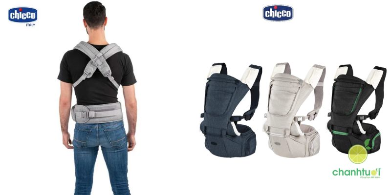 Chicco còn chăm chút cả trải nghiệm của ba mẹ: đai trợ lực êm ở vai và hông giảm áp lực rõ rệt, đặc biệt phù hợp với những buổi dạo chơi dài. Chất liệu cotton thoáng khí giúp cả mẹ và bé không bị nóng bức. Khi cần, bệ ngồi có thể tháo rời hoàn toàn để gọn gàng hơn. Ngoài ra, túi đựng phía trước và ngăn nhỏ có khóa ở đai hông rất tiện để cất điện thoại, ví hay mũ che nắng.