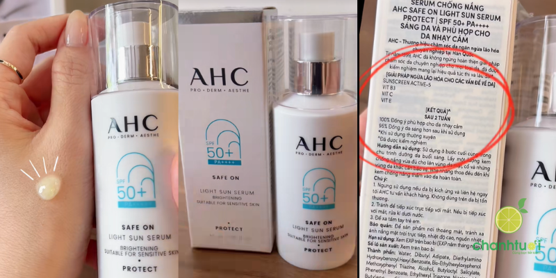 Về công thức, serum chống nắng AHC là chống nắng hóa học, sử dụng các màng lọc hiện đại như Uvinul A Plus, Uvinul T150, Tinosorb S, Isoamyl p-Methoxycinnamate, cho khả năng bảo vệ UVA/UVB ổn định khi dùng hằng ngày.