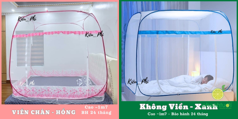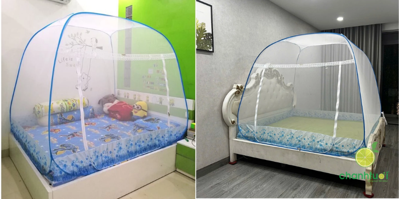 Lưu ý: Bạn nên đo chính xác kích thước lòng giường trước khi mua, vì màn chụp tự bung có khung cố định, không co giãn linh hoạt như màn buộc dây truyền thống.