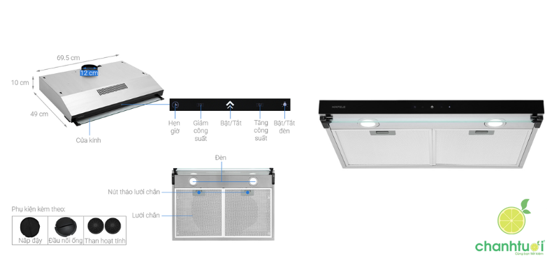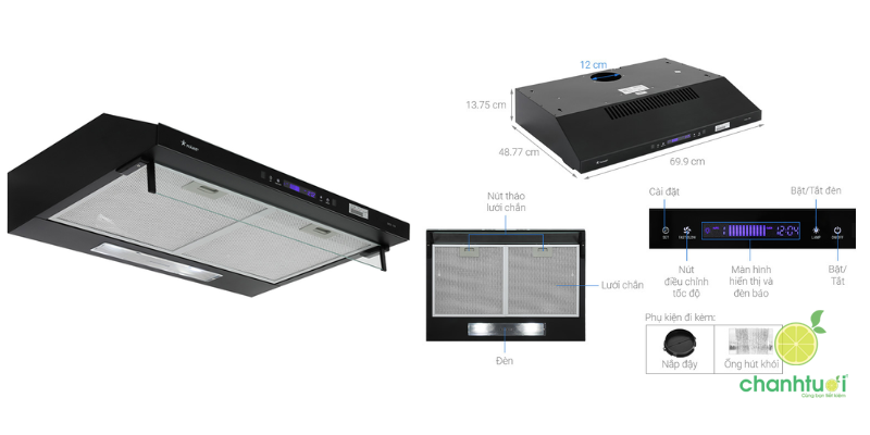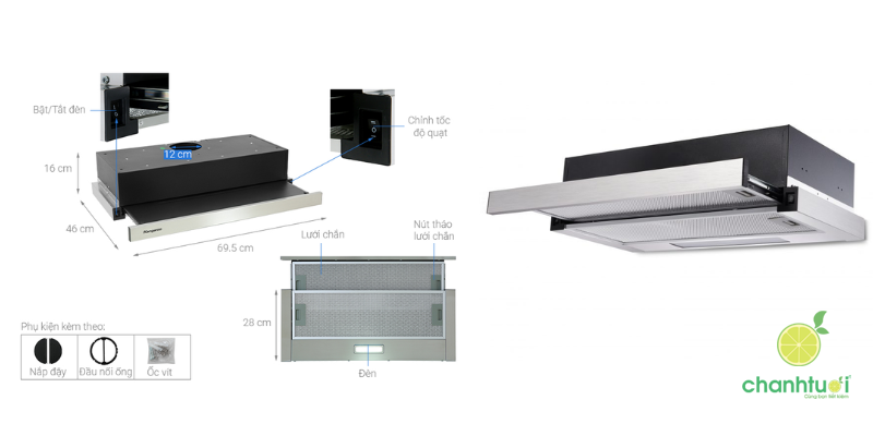 Máy vận hành với cơ chế hút đẩy trực tiếp qua ống thoát khí 16 cm, phù hợp cho các căn bếp hiện đại muốn hút khói, mùi hiệu quả, tiết kiệm năng lượng. Đèn LED 1,5W chiếu sáng chân thực, tiết kiệm điện, hỗ trợ thao tác nấu ăn an toàn. Hệ thống ống thoát khí bằng nhôm không gỉ chịu nhiệt, bền bỉ, ngăn côn trùng xâm nhập, đảm bảo độ bền lâu dài.