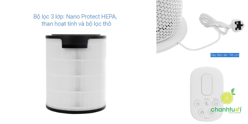 - Bộ lọc HEPA + than hoạt tính loại bỏ bụi mịn, vi khuẩn, mùi.