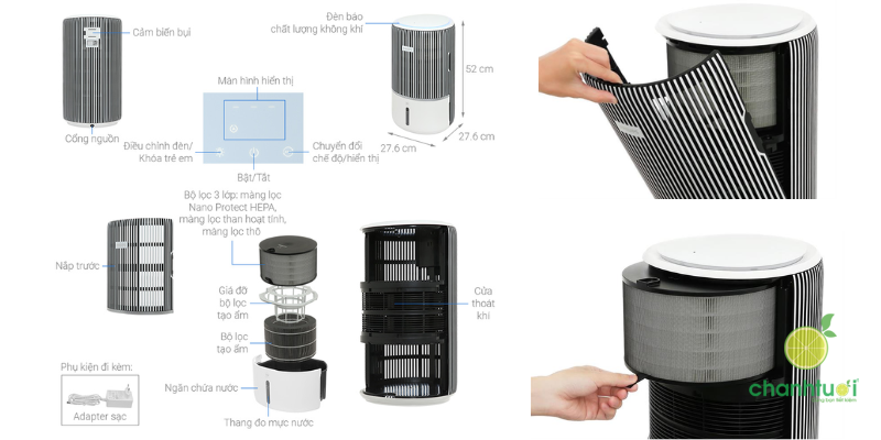 - Lọc không khí + tạo ẩm trong 1 máy, tiện lợi