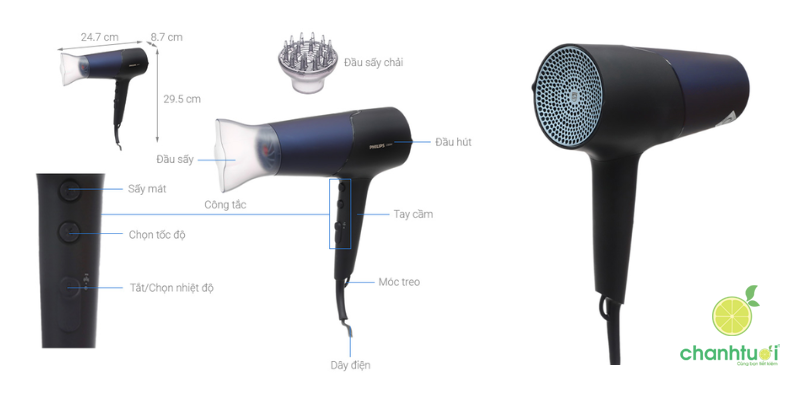 Máy cũng có đầy đủ tiện ích như đầu sấy hẹp hỗ trợ tạo kiểu, móc treo tiện lợi, và đặc biệt là tự ngắt khi quá nhiệt – cực an toàn khi sử dụng lâu hoặc cho gia đình có trẻ nhỏ.
