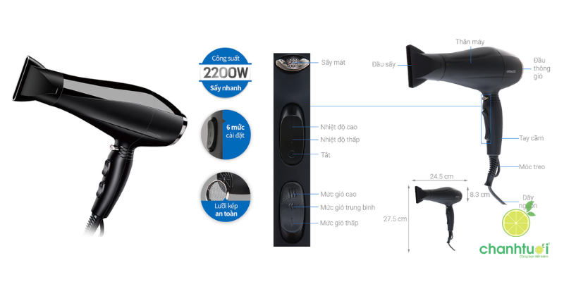 - Công suất cao dễ làm tóc khô