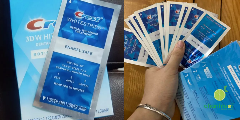 | Thiết kế miếng dán | Mỏng, dài, ôm sát răng, bám chắc | Mỏng, bám rất chắc (Advanced Seal) | Siêu mỏng, tự tan (15–20 phút), hơi ngắn | Mỏng, bám khá ổn, fit trung bình |