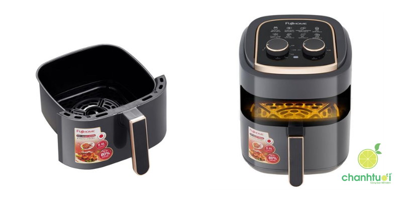 Top nồi chiên không dầu giá rẻ thứ 2 mà mình muốn giới thiệu đến các bạn là nồi chiên của nhà FUJIHOME mã A5GG 5.5 lít Sản phẩm sở hữu dung tích sử dụng 5.5 lít, phù hợp cho gia đình từ 3–5 người, giúp bạn dễ dàng chế biến đa dạng món chiên, nướng hay thậm chí làm bánh.