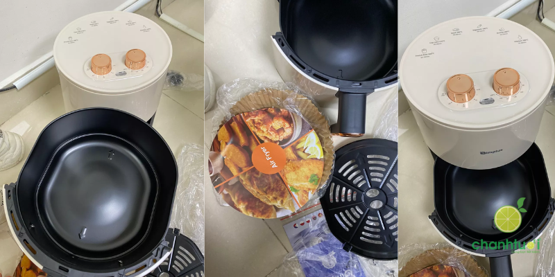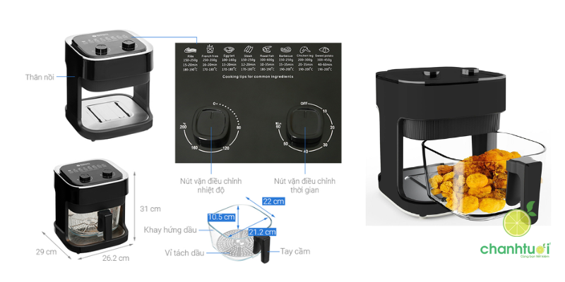 - Chất liệu khay chiên: Khay chiên phủ lớp chống dính cao cấp