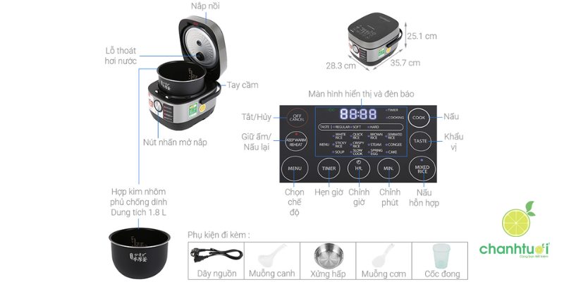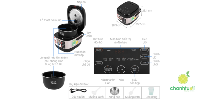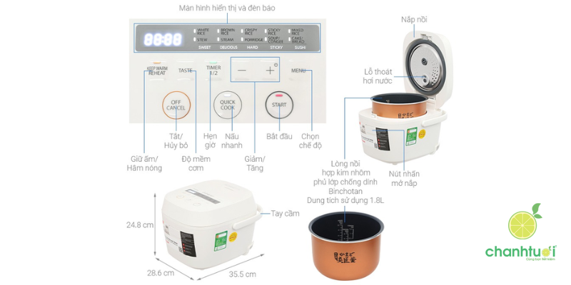 - Dung tích 1.8 lít phù hợp nấu cơm cho gia đình đông người.