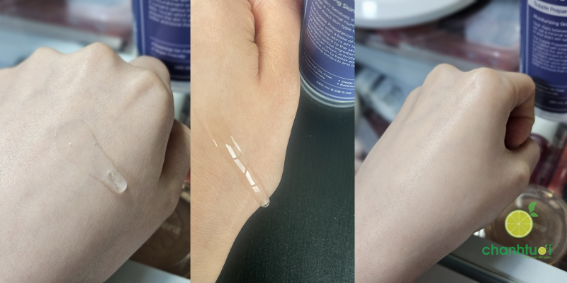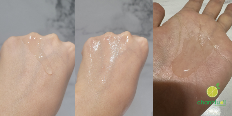 Toner có kết cấu lỏng nhẹ, trong suốt, tương tự essence nhưng không quá đặc, dễ dàng thấm thấu nhanh chóng khi vỗ nhẹ lên da. Lớp finish sau khi dùng mang lại cảm giác ẩm mượt tức thì, da được "ngậm nước" và căng bóng nhẹ mà không hề gây bết dính hay nặng mặt.