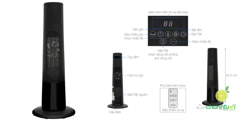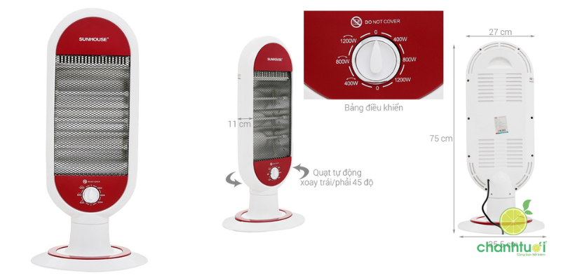 - Công suất sưởi: Chọn quạt có công suất phù hợp với diện tích phòng (từ 800–2000W cho phòng nhỏ, 2000–3000W cho phòng lớn).