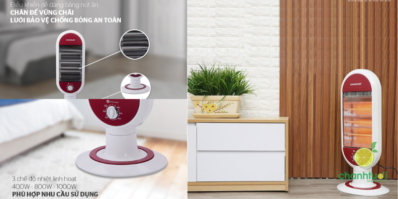 - Công nghệ sưởi: Ưu tiên loại sưởi gốm (PTC) hoặc halogen tùy nhu cầu — sưởi gốm an toàn, tiết kiệm điện; halogen làm ấm nhanh.
