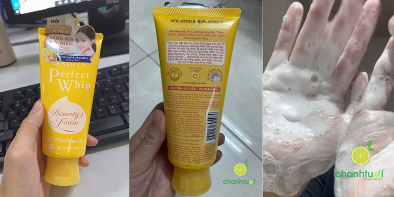 | Senka Perfect Whip Vit C (Poreless Glow) | Vàng | Da xỉn màu, lỗ chân lông to, da dầu/hỗn hợp | ~8–9 | Làm sạch + sáng da nhẹ với Vitamin C + BHA | Cảm giác da sáng hơn sau rửa, bọt mịn | Hiệu quả mờ thâm/thu nhỏ lỗ chân lông ở mức nhẹ | ~110.000–130.000đ |