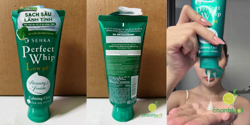 | Senka Perfect Whip Low pH Calming Cica | Xanh ngọc | Da nhạy cảm, da mụn, mọi loại da muốn dịu nhẹ | ~5.5–6.0 | Làm sạch dịu nhẹ, cân bằng pH, làm dịu da | pH thấp chuẩn, bọt êm, rất dịu cho da nhạy cảm | Làm sạch nhẹ, chưa đủ nếu da makeup | ~120.000–140.000đ |
